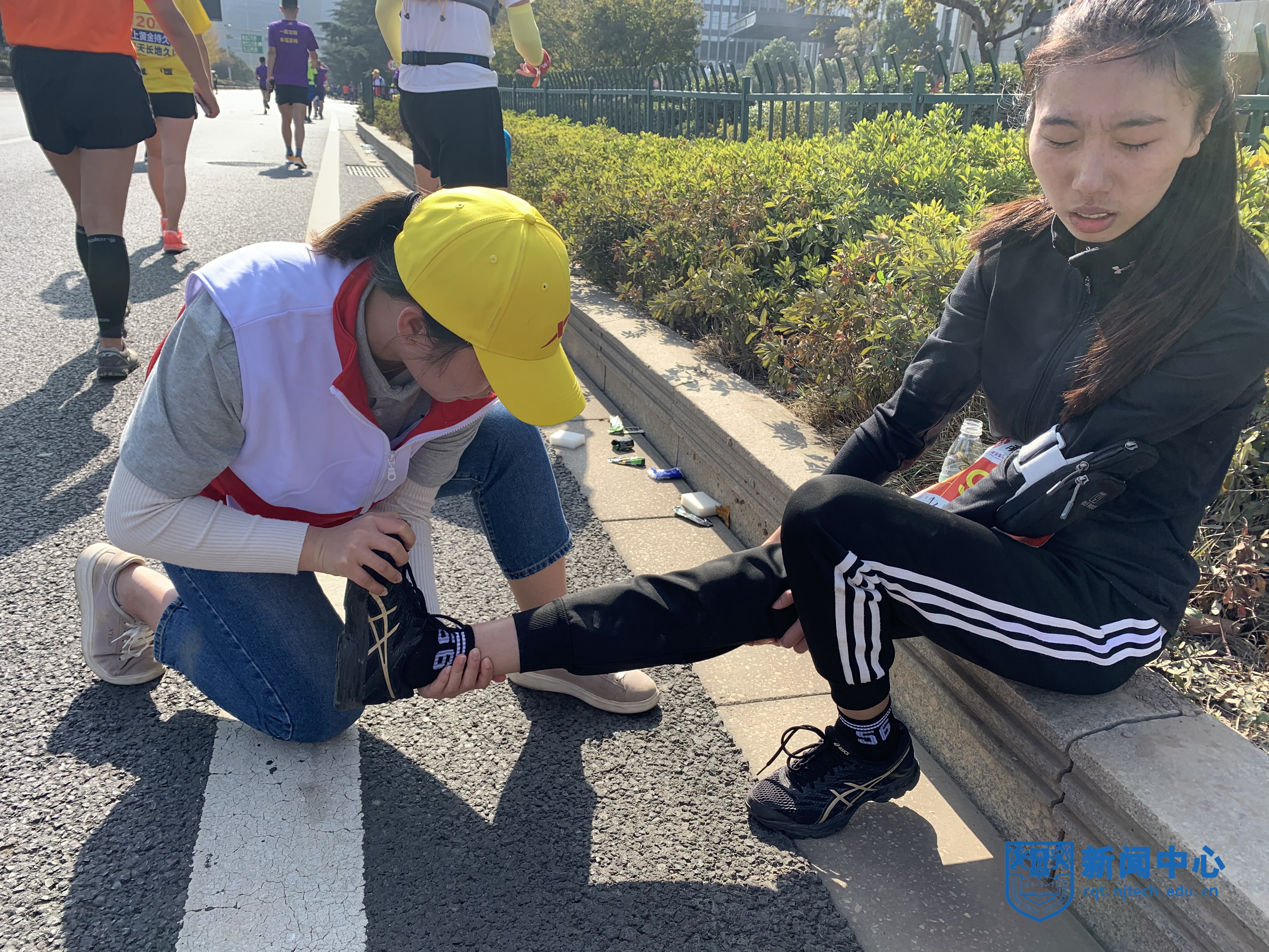此次马拉松比赛,伤员的伤情大多集中在大小腿抽筋、肌肉拉伤上,我校志愿者积极救助,并伴以适当的人文关怀,尽力让受伤的选手们感到温暖。上午11点左右,在36km医疗点附近一名外国跑者倒地呕吐,志愿者张正和张晓敏第一时间发现,做好紧急处理后,并立即叫来救护车人员,随后将伤者抬上担架送到救护车上进行救治,其间救护车志愿者杨浩帆充当翻译,志愿者吕坤昆全程陪同,确保伤者的生命安全。