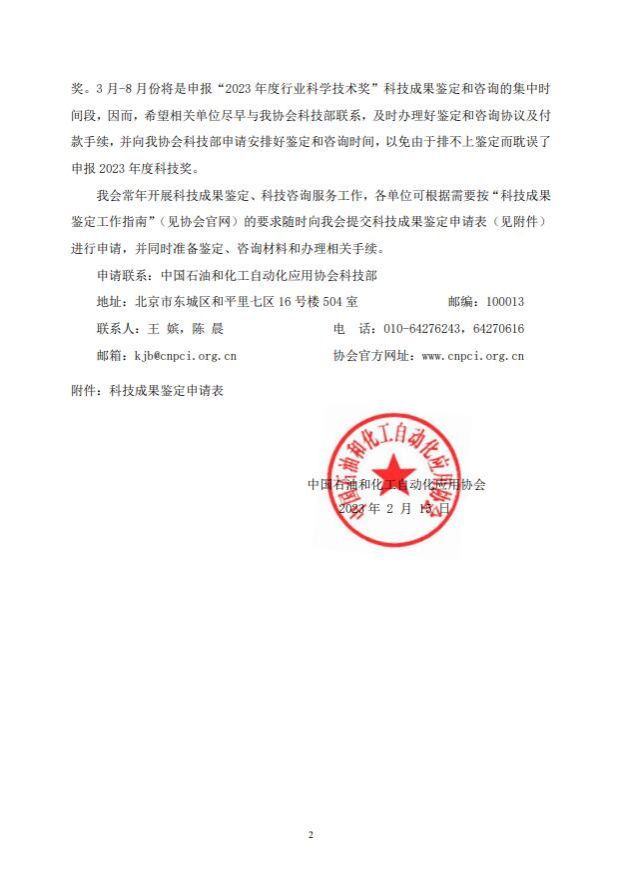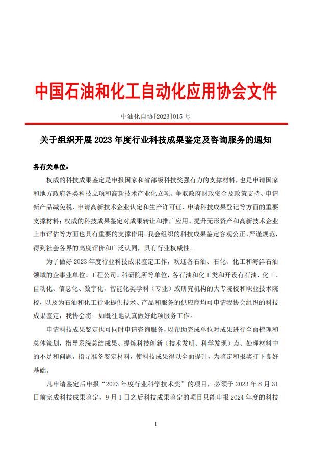 【成果鉴定】(2023年报奖的8月31日前鉴定完毕)关于组织开展2023年度中国石油和化工自动化应用行业科技成果鉴定及咨询服务的通知
