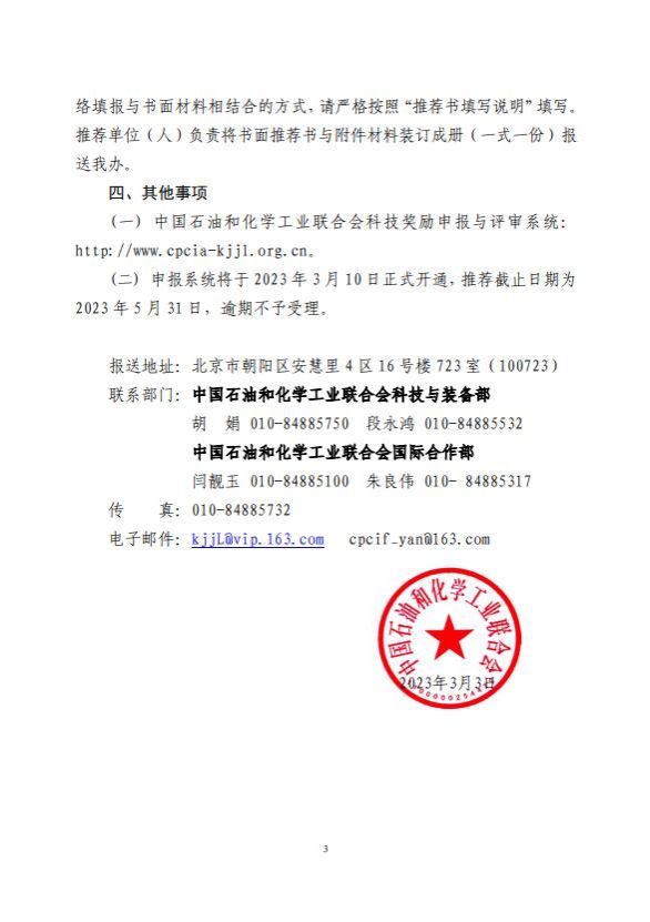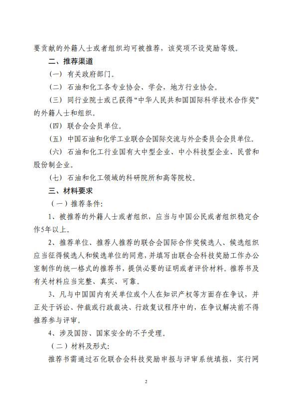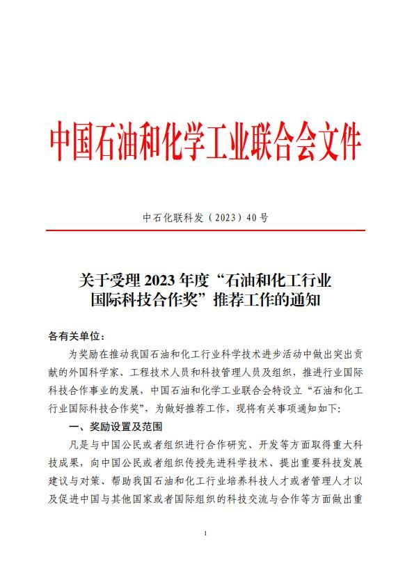 根据中国石油和化学工业联合会《关于受理2023年度“石油和化工行业国际科技合作奖”推荐工作的通知》有关要求,该奖项申报工作现已启动,请做好相关奖项组织工作。并请有意向申报者于2023年3月31日(周五)前与科学研究院沟通并获取系统账号,对照条件和要求,做好准备,认真填报。