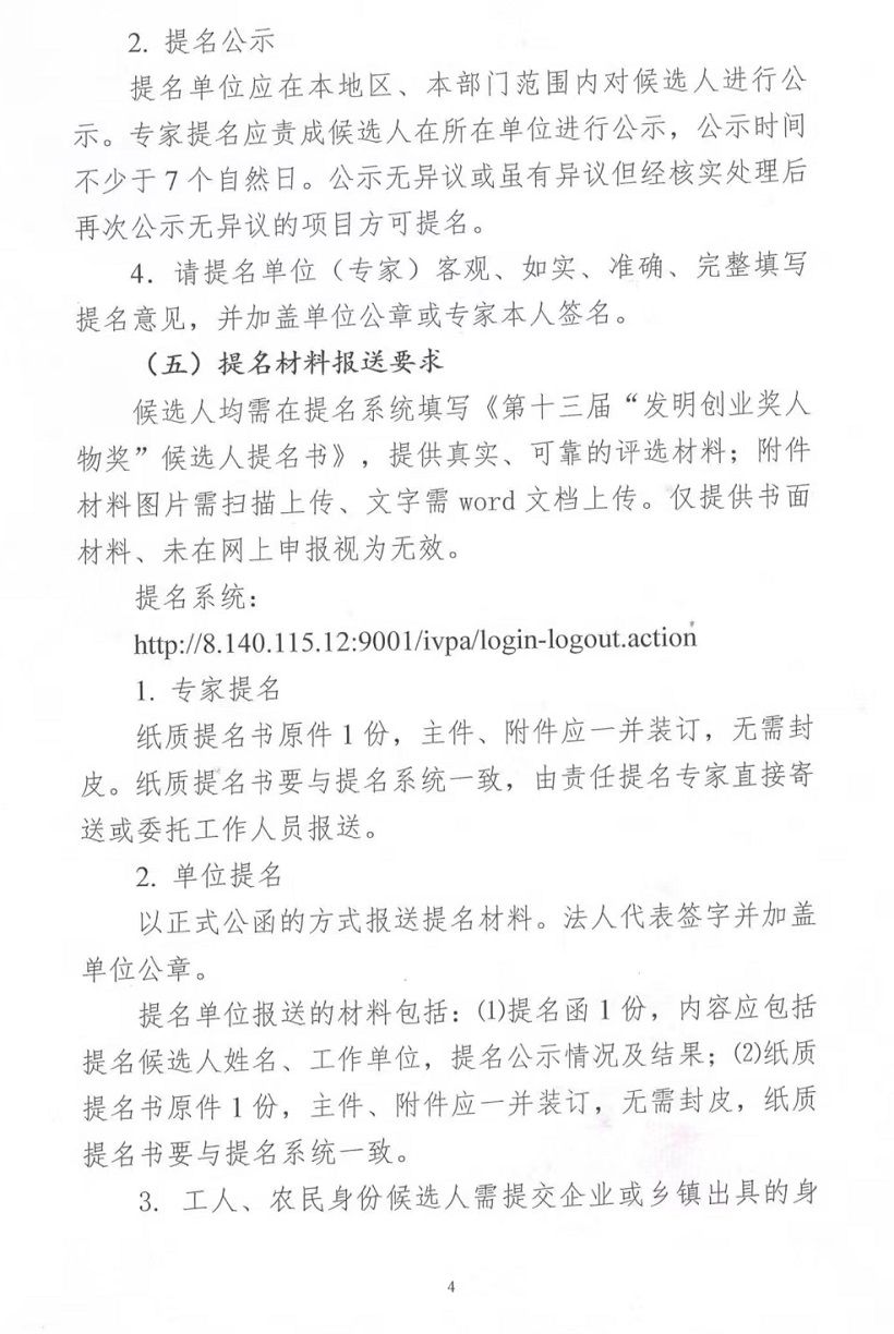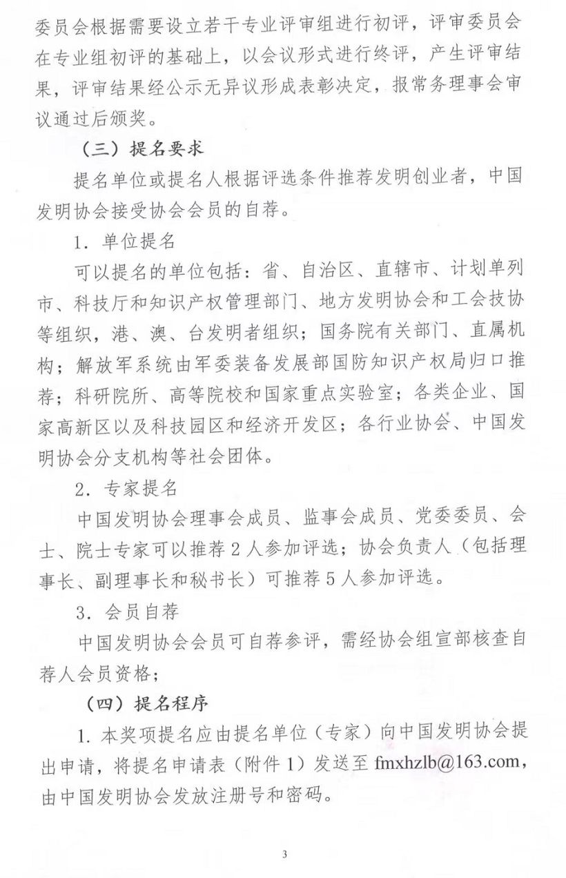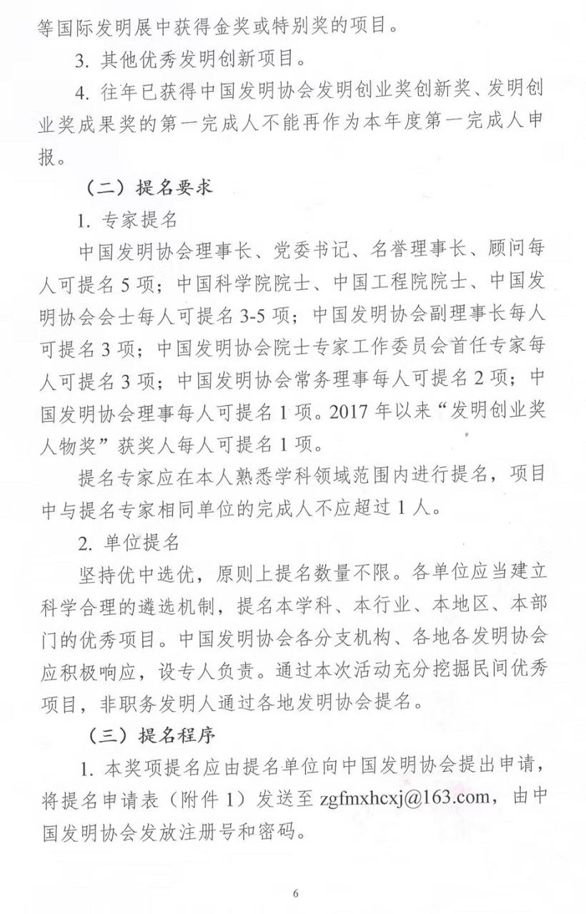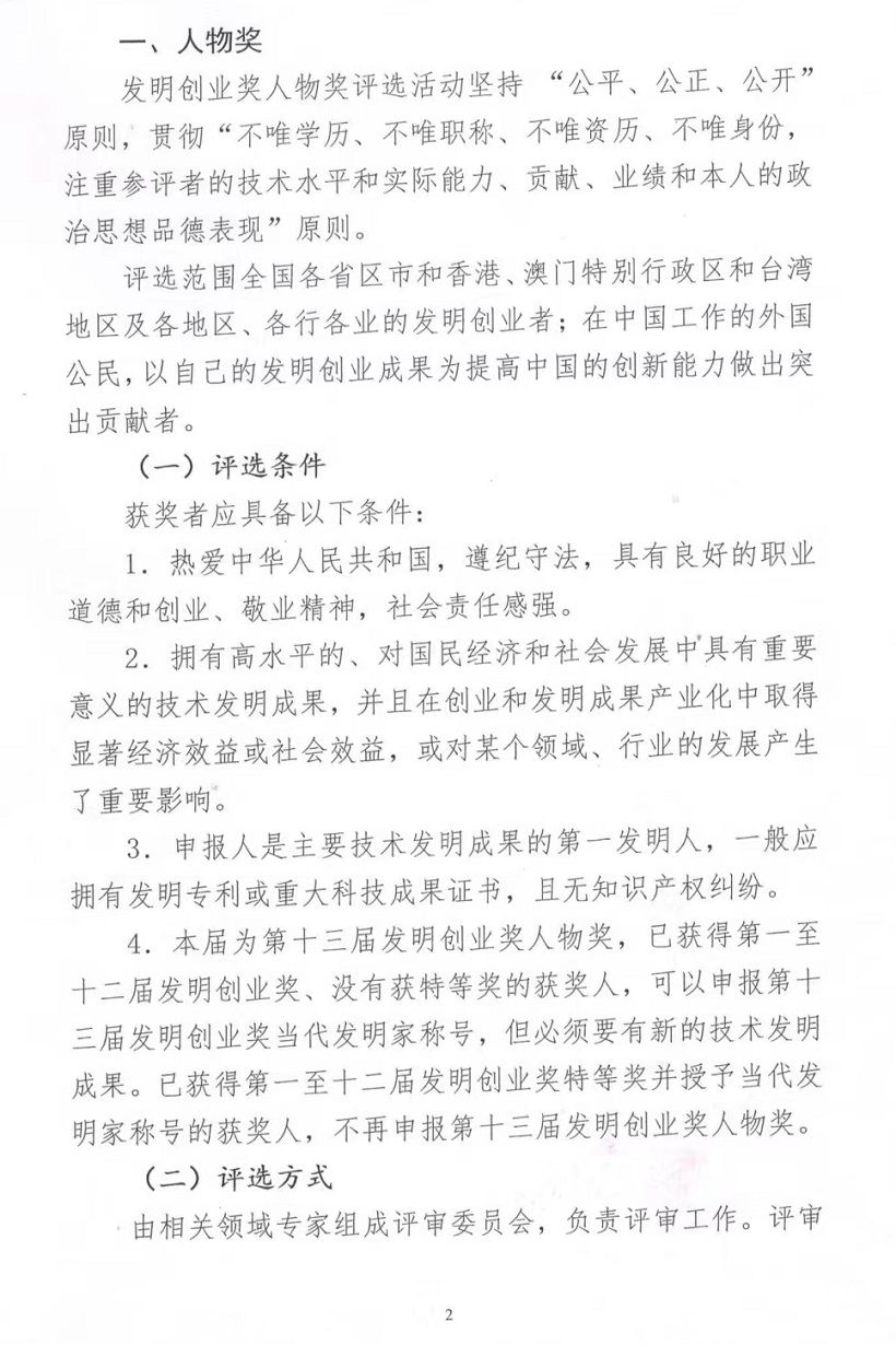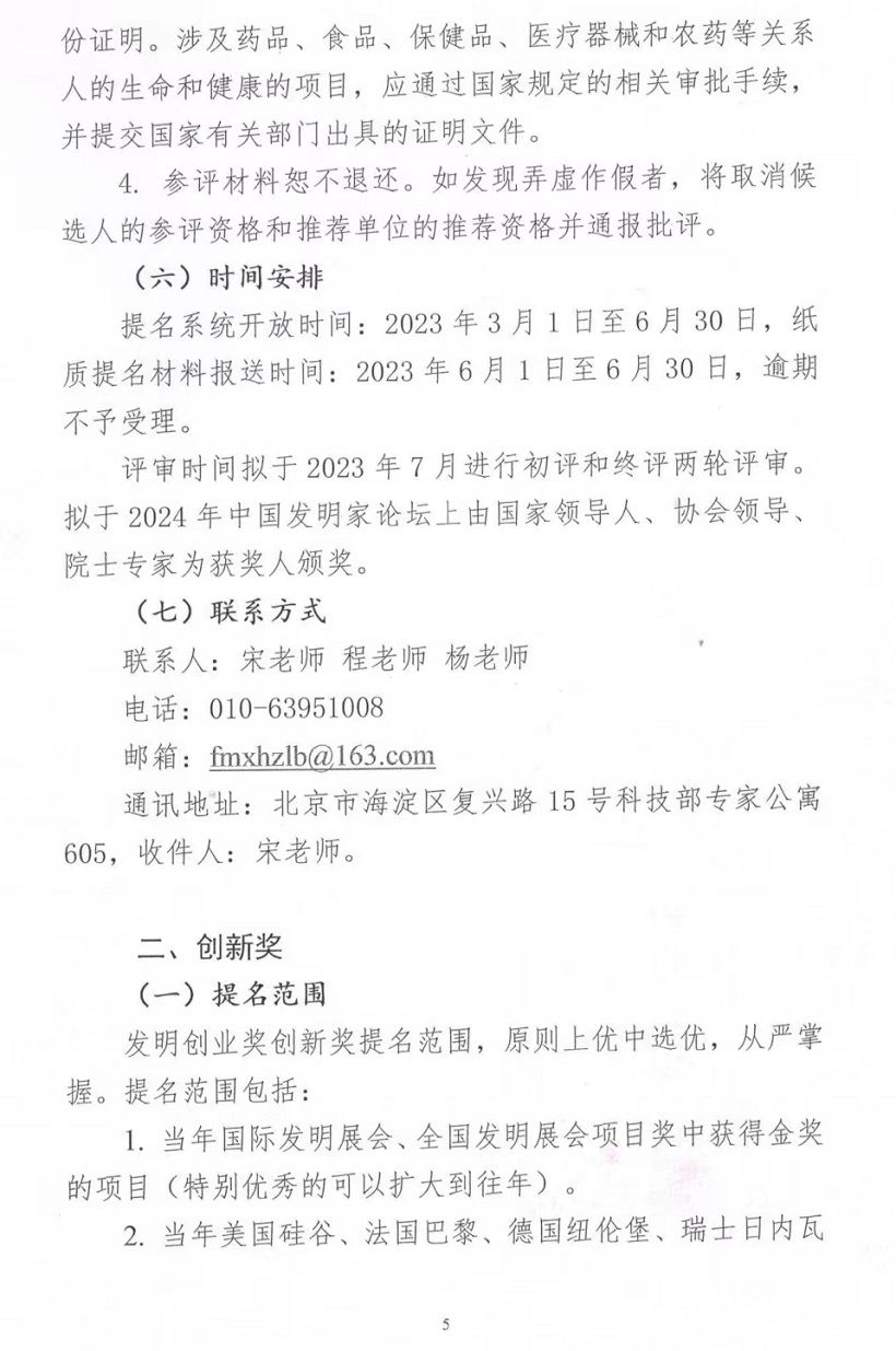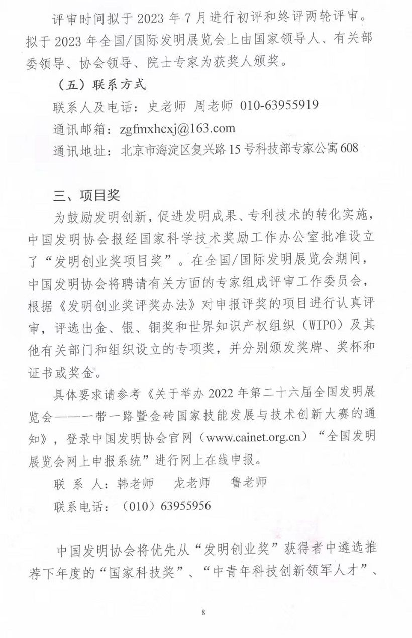 根据《中国发明协会关于2023年度“发明创业奖”评选工作的通知》有关要求,该奖项申报工作已启动,请做好相关奖项组织工作。中国发明协会“发明创业奖”包括项目奖、创新奖、人物奖和成果奖,其中人物奖和成果奖交替启动,今年启动人物奖;申报项目奖的成果须是中国发明协会全国发明展览会参展成果。
