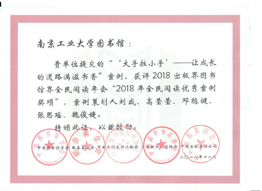 11月23日,由全民阅读活动组织办公室、江苏省新闻出版局,中国图书馆学会主办,中国图书馆学会阅读推广委员会等单位承办的“2018全国出版界图书馆界全民阅读年会”在江苏成功举办。我校图书馆牵头申报的案例《大手拉小手——让成长的道路满溢书香》获得2018全民阅读优秀案例奖,全国共有46家单位获得该奖项。