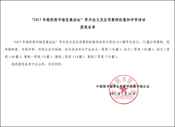 图书馆荣获“2017年高校图书馆发展论坛”案例征集二等奖