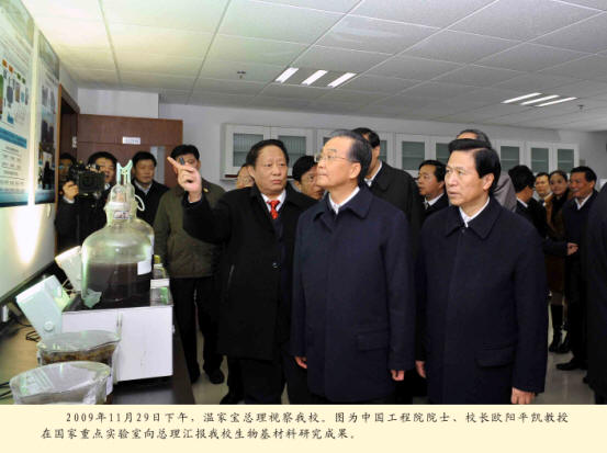 在学校丁家桥校区科技创新大楼一楼大厅,温总理一边参观我校科技创新成果展览,一边听取校长欧阳平凯院士、党委书记王德明教授的讲解以及学校教育教学改革情况汇报。随后,温总理到我校材料化学工程国家重点实验室,分别参观了位于科技创新大楼13楼的生物基材料实验室和位于9楼的膜材料和膜过程实验室,与在场的研究人员一一握手,详细听取国家生化中心主任、校长欧阳平凯院士和国家重点实验室主任徐南平院士的介绍,对学校给予高度评价,认为这所大学很有特色,“注重理论联系实际,把学校的课程、实验、科研都同现在经济社会发展的需求紧密结合起来,这样培养出来的人才就会为社会所需要,这种办学的方向也是对的” 。