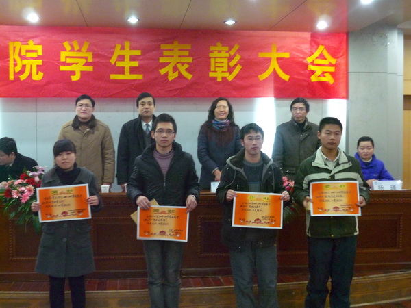 主席台领导为受表彰的集体和个人颁发了奖状。应物0701班毛云飞、应化0702班周云、应化0601班高海健分别代表院先进班级、院优秀学生干部和院优秀党员做了发言。他们从班级凝聚力、工作责任心和党员素质等方面谈了自己的成长、成绩和心得,与大家共同分享收获的喜悦。