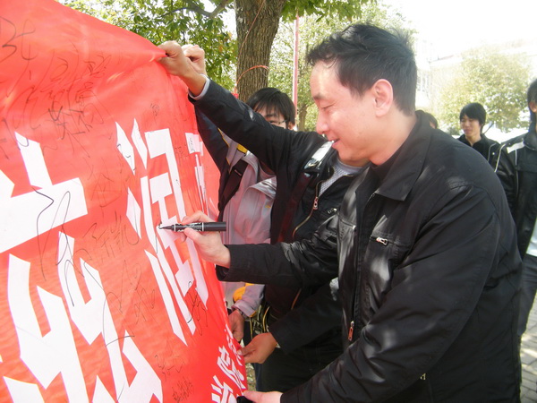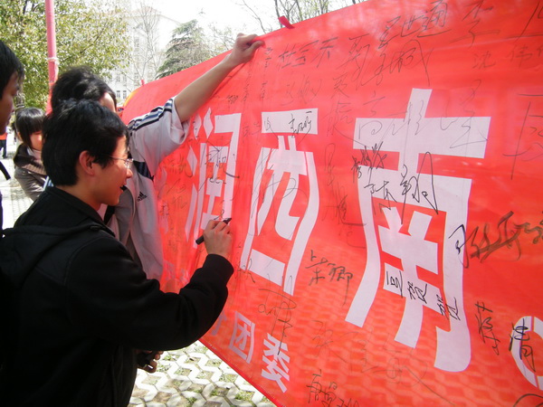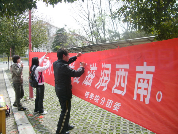 学生会的同学们早早来到募捐现场,张贴了节约用水的宣传海报和西南灾区的图片,并饱含热情地为来往的同学们宣传本次活动,积极号召大家为受灾地区的同胞献出自己的爱心。在场的同学们都很受感动,纷纷在横幅上签名,并通过捐款献上了自己的爱心。在活动进行的过程中也有很多老师加入,他们慷慨解囊,将现场气氛推向一个又一个高潮,使募捐现场洋溢着我校师生帮助西南灾区的热情。这次充分体现了同学们对灾区人民的关爱,同时也进一步提高了自身的节水意识。理学院将代表所有奉献爱心的师生,将募捐款项及时地通过南京市红十字会捐给灾区,给他们带去爱的滋润。
