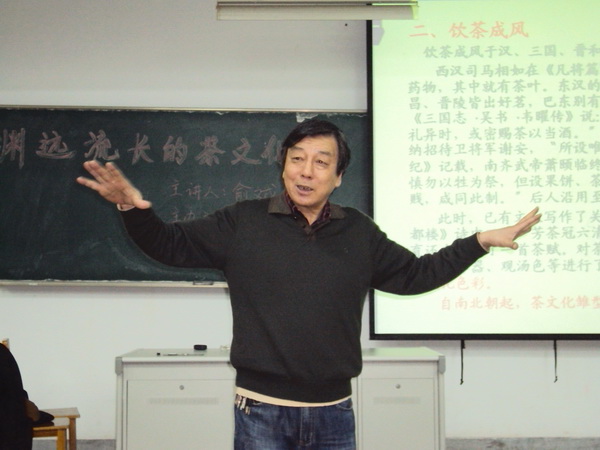 本次讲座的主讲人是理学院资深教授俞斌老师。俞斌教授在校开设《红楼梦》等公选课多年,受到了众多同学和老师们的好评。每个学期,他都会为同学们做各方面的讲座,因此,同学们对于俞教授的讲座积极性很高,早早地就来到了讲座地点。讲座开始,俞教授以自己多年的教学经验,启迪在场的理工科专业的同学们要多接受文学艺术的教育,将逻辑思维与发散思维相结合。随后,俞教授又以古语强调了茶文化的重要性,从而切入主题。俞教授向大家介绍了茶文化的大体概念,并从物态、制度、行为、心态四个层次分述了茶文化的兴起与发展。接着,他详细地阐述了茶文化的发展历程:透过《茶经》和《神农食经》,同学们了解到饮茶的起源史;由汉、晋、南北朝到唐、宋、明、清,我们体会了饮茶的成风、兴起、兴盛以及最终的鼎盛。一句“茶茗久服,令人有力、悦志”让我们感受到了饮茶的益处;一句“芳茶冠六清,滋味播九区”让我们体会到了茶芳的魅力。俞教授还向大家介绍了茶叶的物态文化,使大家认识了茶叶的七大分类。最后,俞教授从性质、工艺等方面详细的介绍了龙井和乌龙,并以对比的形式介绍了红绿两茶,又以自己的亲身经历强调了“功夫茶”技艺的妙处。在场的学生都饶有兴趣地听讲,不时报以热烈的掌声。