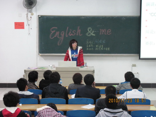 阅读次数:发布时间:2010-12-07为了配合同学们准备全国英语四、六级考试、提高同学们对大学英语的学习能力和运用能力,由校团委主办、理学院分团委承办的English and Me (英语和我)主题讲座于11月23日晚6点半在厚学202成功举办,讲座由我校外语学院刘农宏老师主讲。