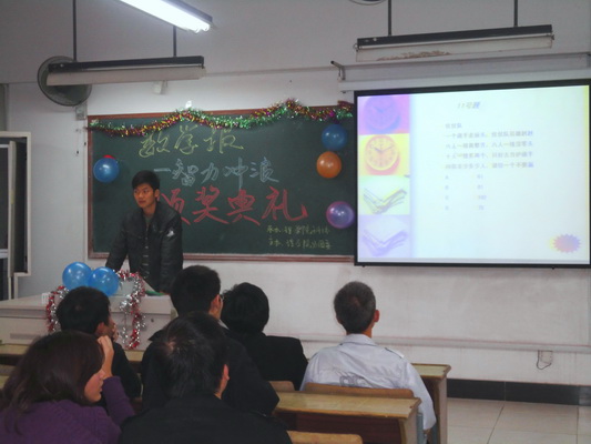 本期《数学报》,在同学和老师们的共同努力下,内容更加精彩、丰富。其中包括了“希尔伯特”的23个数学问题,有关数学应用方面的“比特战争”,“费马大定理”,以及“数学家与政治家的联系”等。让同学们在趣味故事中体会到了数学的魅力,进而调动同学们学习数学的热情。当然数学报中最吸引同学们的依旧是“智力冲浪”一栏。这期的“智力冲浪”题目不是很难,但是思维性很强,也很有趣味性。很多同学早早就交来了他们的答案,本着公平公正的原则,经过细致地批改,最终评选出十二名获奖选手,其中一等奖两名,二等奖四名,三等奖六名。并于11月24日晚上6点,在厚学楼408室举行了颁奖典礼。