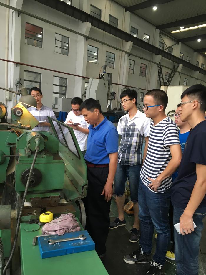 同学们在工大数控陈力军老师的带领下观摩车床师傅作业,也从中学到了许多书本以外的知识:比如在三爪卡盘上夹纸片是为了保证同轴度和防止夹紧变形;再比如万能工作台是通过两个电机的配合测量齿轮箱在一定转速和一定负载扭矩下的性能,两个相同的电机一个充当电动机,另一个充当发电机,通过带轮连接。“千里之行,始于足下”,师傅边操作演示边用实际经验告诉同学们,理论来源于实践,也终归要归于实践,应用于实践。