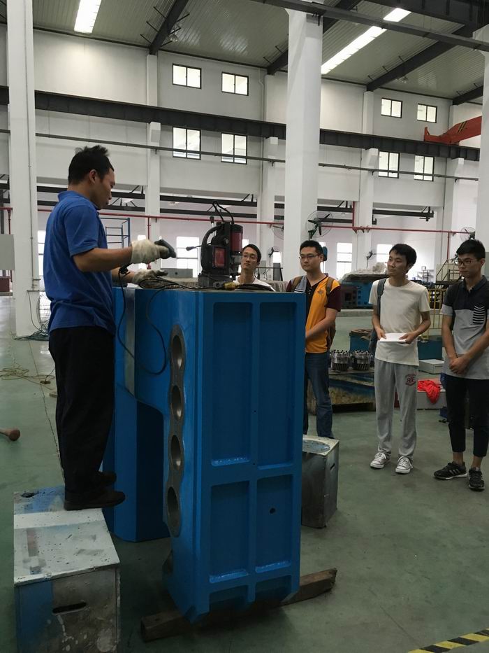 大型设备的装配并不是简单的组装,它需要对每一个过程都很熟悉熟练,从小零件开始一步步地装配成大元件。如装配过程中有些零件不是正常啮合,就需要临时加工处理使之完美契合。装配过程中最常用的工业试剂是稀释剂,它常被用来在油漆施工中重新调整油漆粘度,使之符合施工要求,并且达到涂层表面光亮平滑的目的。另外一些比如敲打、定位、划线、钻孔等手段也是必要的。经过这个环节,同学们深刻体会到“装配”是一门千锤百炼的技术活,需要每一步的精心打磨,才能在最后得到完美满意的成品。