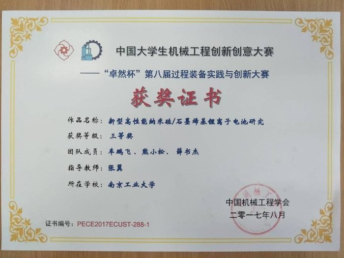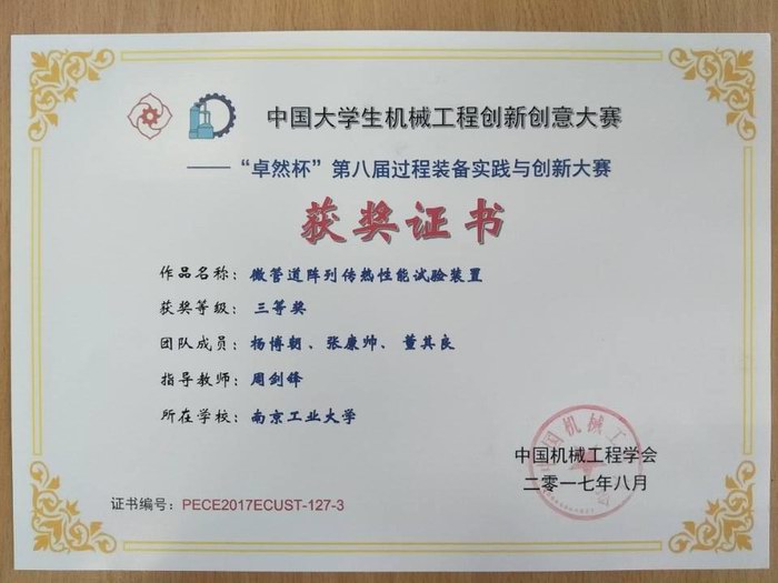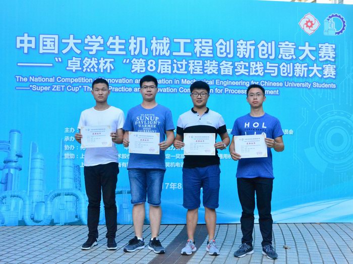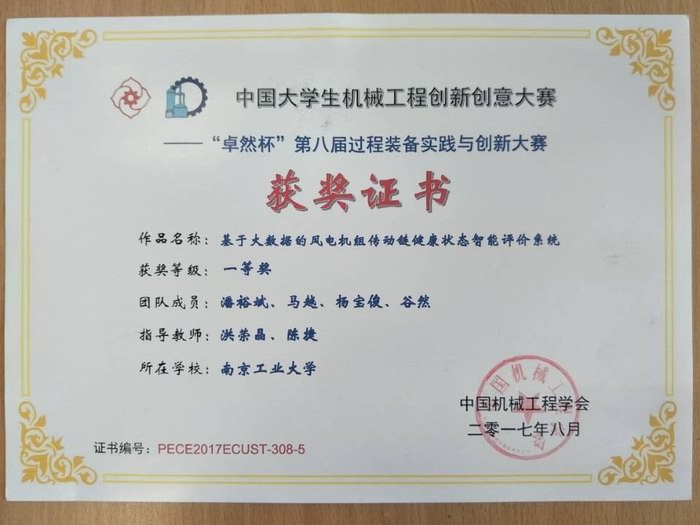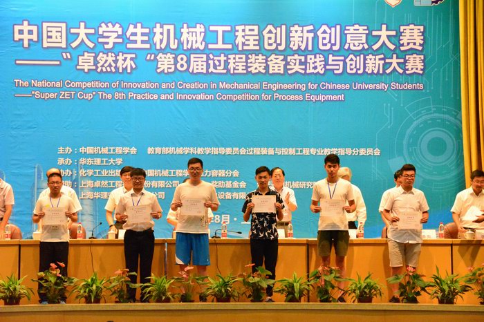 8月26日至27日,来自全国三十余所高校的师生齐聚华东理工大学逸夫楼,参加由中国机械工程学会主办,华东理工大学承办的中国大学生机械工程创新创意大赛——“卓然杯”第八届全国大学生过程装备实践与创新大赛颁奖及作品展示会。通过两天的评审工作,我校学子在此次大赛中再创佳绩,其中机械与动力工程学院洪荣晶教授和陈捷教授指导潘裕斌、马越、杨宝俊、谷然完成《基于大数据的风电机组传动链健康状态智能评价系统》项目荣获一等奖,机械与动力工程学院周剑锋副教授指导杨博闻、张康帅、董其良完成的《微管道阵列传热性能试验装置》项目和能源科学与工程学院张翼老师指导车鹏飞、熊小松、薛书杰完成的《新型高性能纳米硅/石墨烯基锂离子电池研究》项目均荣获三等奖。洪荣晶教授和陈捷教授荣获优秀指导教师。