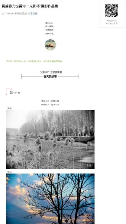 为扩大作品受众面,讲“春天的故事”文化系列活动之摄影作品展率先于我院学生会新媒体平台——南工机械微信公众号中举办,并开展线上投票活动,吸引更多同学关注。智能化通讯技术迅速发展的当代,这些新传播渠道能够有效加快传播速度、扩大影响范围。