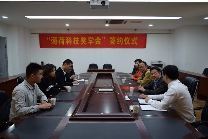 最后,汤兵总经理与凌红、唐明辉分别签订了“薄荷科技奖学金”捐赠协议,陈红喜给汤兵总经理颁发捐赠证书,并全体合影留念。