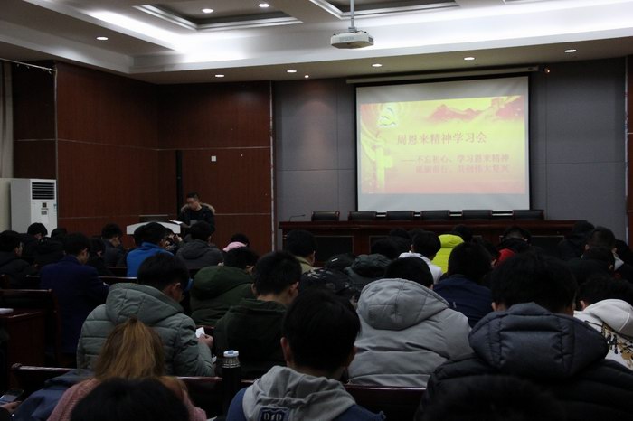 2018年3月5日,正值周恩来同志诞辰120周年纪念日,为深切缅怀周总理为党、人民和国家建立的卓著功勋,追思和学习他作为中国共产党人杰出楷模的崇高精神,机械学院本科生第二党支部,第三党支部及17研第一党支部于当晚在机械E楼报告厅联合开展了主题为“不忘初心,学习恩来精神;砥砺前行,共创伟大复兴”周恩来精神学习会。