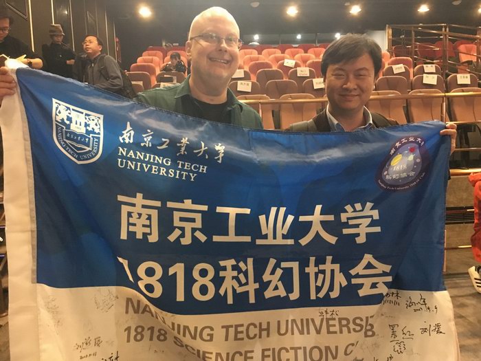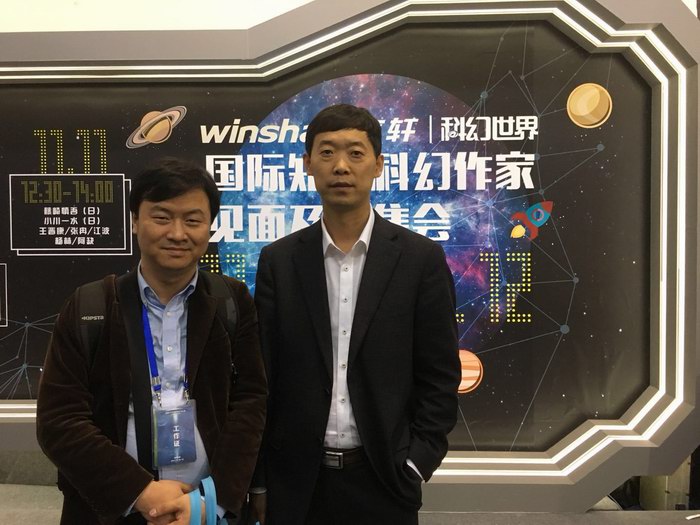 会议期间,付昌义老师作为新利18彩票 1818科幻协会指导老师与参会的中外科幻作家编辑学者罗伯特.索耶、立原特耶、刘宇昆、刘兴诗、杨潇、谭楷、吕应钟、刘慈欣、王晋康、韩松、何夕、董仁威、姚海军、杨帆、赵海虹、凌晨、杨平、陈楸帆、夏笳(王瑶)、三丰(张锋峰)、宝树、江波、萧星寒、张冉、阿缺、谢云宁、拉兹、汤哲声、李广益、周群、魏然、肖汉、姜振宇、任冬梅、孙悦、张翼、刘明亮等进行了深入的交流,享介绍了我校科幻协会建设的经验,并向科幻作家和科幻学者发出邀请,欢迎他们方便时来访我校。众多科幻作家也答应了邀请。此间,他还参加众多科幻分论坛,并观看了2017年中国银河奖的颁发,也见证了众多高校科幻协会的蓬勃兴起。颁奖结束后,他还参加了传统的科幻聚会。