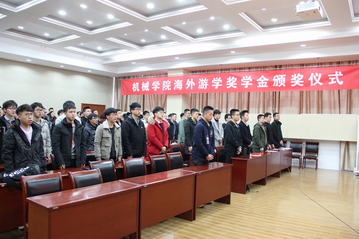 颁奖仪式在国歌声中开始,付昌义老师首先介绍本次活动背景和到场嘉宾,唐明辉老师在致辞中表示希望同学们尽早做好规划和准备,奋力学习,积极争取海外游学的机会。凌红老师宣读了海外游学奖学金的表彰决定和获奖学生名单,并举行颁奖仪式,获奖者与几位老师合影留念。过装1602孙鸿、机械1602班田家彪、机械1603班李嘉威三位获奖学生代表依次分享了自己参加境外高校交换、游学的经历和感受,丰富多彩的游学生活引得同学们的热烈掌声。
