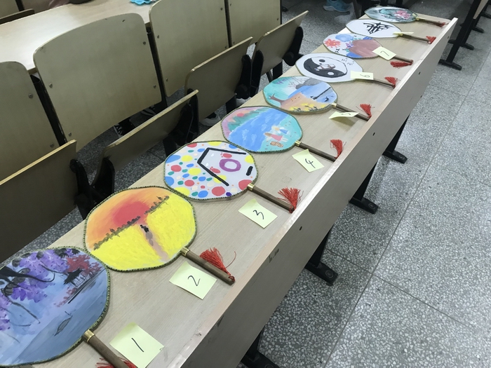 本次活动首先通过线上宣传进入学生视线,活动面向大一的13个班级,最终有25组的同学参加。活动当天每组1~2人,绘画一把扇子,活动现场提供给了大家扇子和绘图工具,同学们可根据自己的创意和想法来作画,完成后每组分别上台表达了自己的画图想法和深层的蕴义。通过个人和集体的展示,最终根据现场选手和评委的投票结果评选出一等奖1组,二等奖2组,三等奖3组,并当场颁发了奖状和奖品。