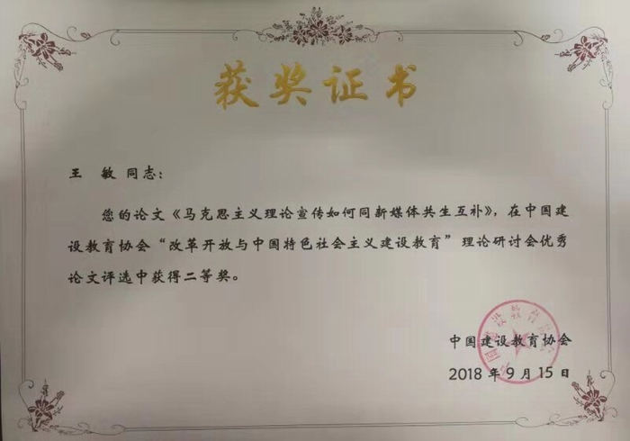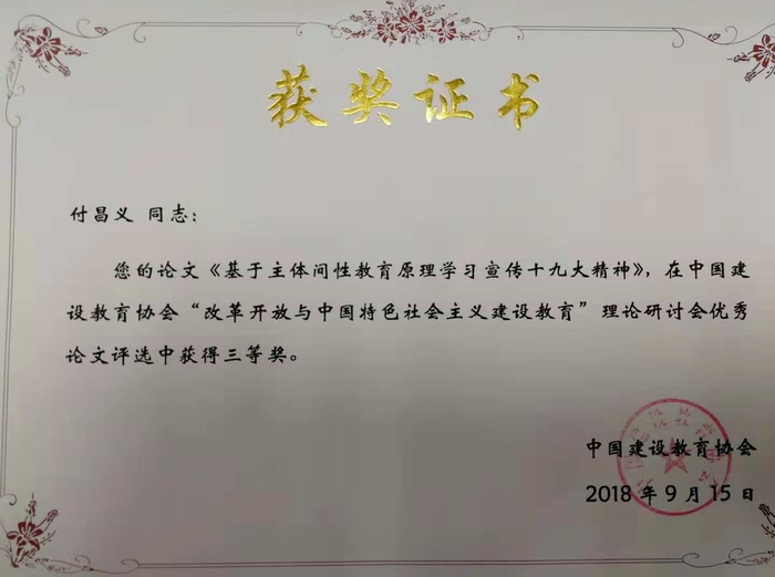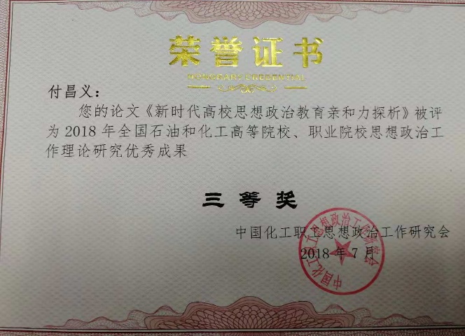 其中,在中国建设教育协会举办的“改革开放于中国特色社会主义建设教育”的理论研讨会中,王敏老师的论文《马克思主义理论宣传如何同新媒体共生互补》荣获二等奖,付昌义老师的论文《基于主体间性教育原理学习宣传十九大精神》荣获三等奖。在中国化工职工思想政治工作研究会开展的2018 年全国石油和化工高等院校思想政治工作理论研究优秀成果评选活动中,付昌义老师参与撰写的论文《新时代高校思想政治教育亲和力探析》荣获三等奖。