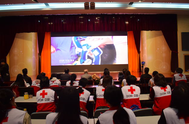 在江苏省红十字会的支持下,江苏省人民医院陈彦和秦超两位专家编拍的第三部应急救护宣传视频——《灾难来临》MV,4月14日上午在南京科技馆首映。中华医学会灾难医学分会名誉主委、中国急救医学奠基人、国际人道医学会理事王一镗教授,江苏省红十字会副会长徐国林先生,江苏省卫生计生委应急办主任顾帮朝先生,江苏省人民医院副院长杨志健先生,南京市红十字会常务副会长张敏女士,雨花台区委副书记、区红十字会名誉会长袁传军先生,南京医科大学副校长、江苏省医学会科学普及分会主委鲁翔先生出席仪式。我校红十字会百名师生、众多急救专家及相关工作人员共同参与本次活动。江苏新闻广播电台主持人申琪女士主持本次活动。