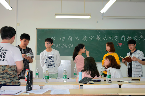 上午10:00,南京航空航天大学的志愿者抵达我校,校红十字会的志愿者先带领他们参观校园,之后大家来到同和514室进行交流。