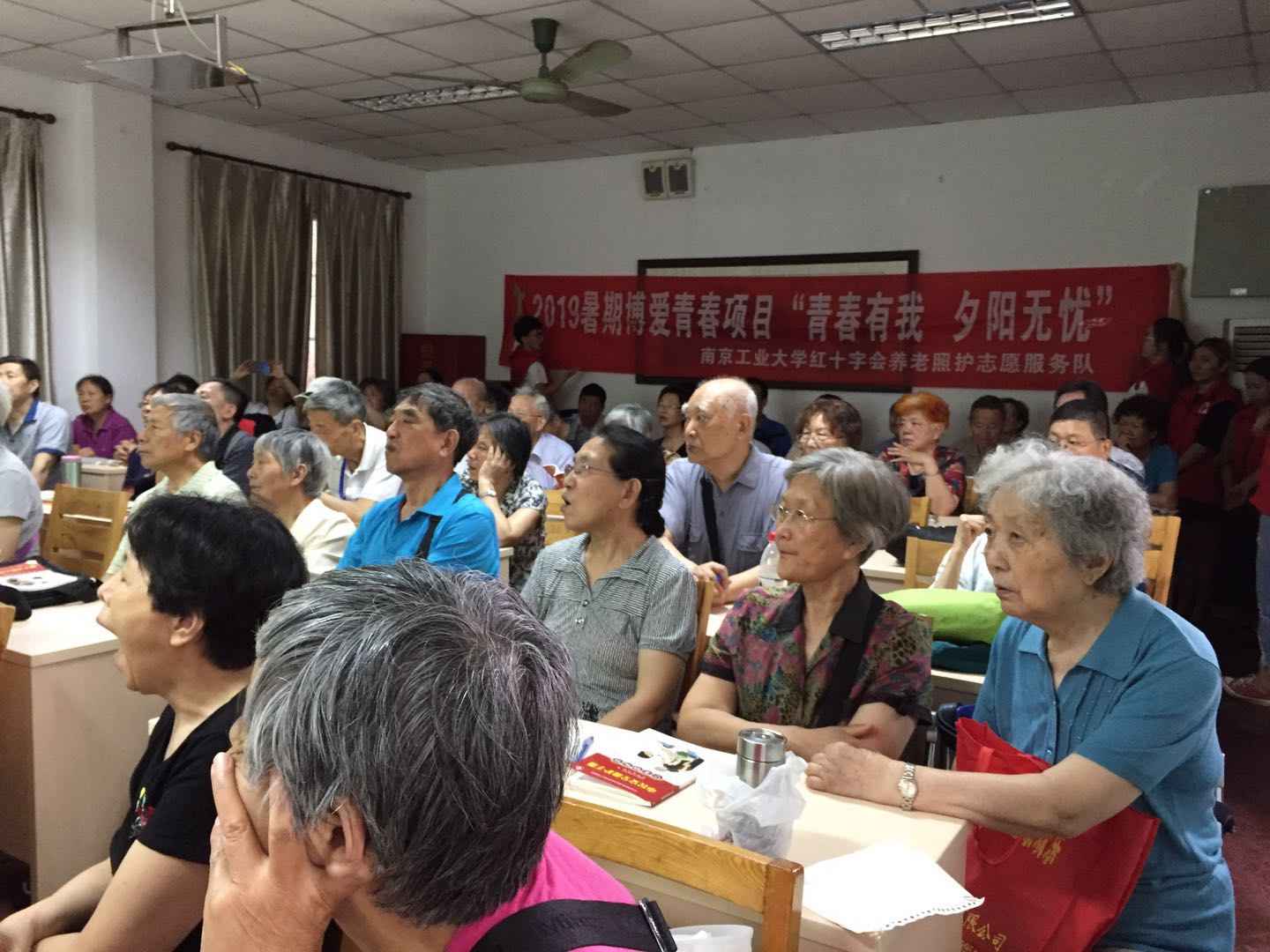 上午8:30,“青春有我夕阳无忧”博爱青春项目组的师生团队在现场免费为老人们测血压、血糖,并进行饮食、运动等健康指导。9:00救护培训讲座开始,校医院副院长徐振霞老师详细讲解了心肺复苏与AED的操作步骤,介绍了江浦校区4台AED的安放位置。随后,校红十字会的志愿者们指导老人们操练。