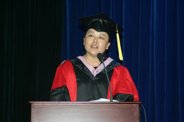 校优秀毕业生余惠明同学、院学生会主席李红倩同学相继作为毕业生和在校生代表发言。其间,何冰芳教授、余惠明同学分别代表教师和毕业班学生向毕业生和低年级学生赠送了恩师赠言和毕业留言。对母校的眷恋、与同窗的友谊、以及对未来的憧憬和希望,都通过她们的言语在礼堂中久久回荡。