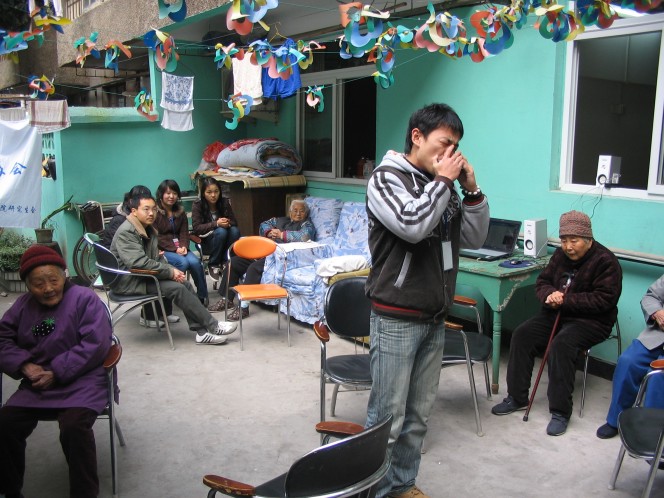 在观音里社区敬老院里,“爱心志愿者协会”的成员与老人们共同度过了一个愉快的、记忆深刻的上午。缪昌美老师代表大家向老人们致以了亲切的问候。同学们给敬老院的老人赠送了“暖手宝”,并表演了丰富多彩的娱乐节目,有黄梅戏《女驸马》选段、口琴《外婆的澎湖湾》、歌曲《南泥湾》,还即兴为老人表演了舞蹈。在一首首熟悉的旋律中,老人们的脸上露出了笑容,仿佛又回到了年轻的时代。在音乐声与欢笑声中,老人们敞开胸怀与同学们聊起他们的往事。他们对十七大提出“加快推进以改善民生为重点的社会建设”倍感欣慰。活动结束后,老人们和护理人员向爱心志愿者们表达了不尽的感激。爱心志愿者们向老人们挥手道别表示常来敬老院看看。其情其景让每个人都真切地感受到了关爱的力量和心中的温暖。