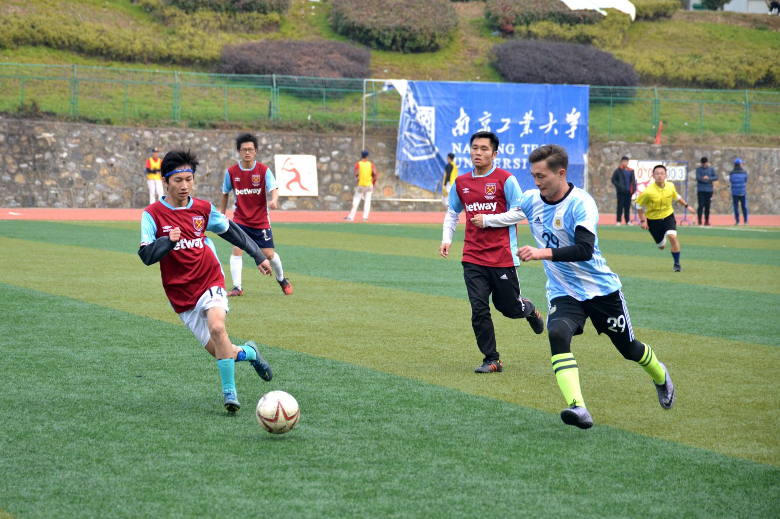 随着裁判的一声哨响,比赛正式拉开了帷幕。上半场,数理建筑联队来势汹汹,一次又一次撕开经管测绘联队的防线,将球射进禁区。但经管测绘联队的球员们始终沉着冷静,不慌不忙地应对进攻,守门员更是屡次截住了数理建筑联队的射球。时间在一点一滴的流逝,经管测绘联队的球员终于抓住了机会,直奔数理建筑联队禁区,势如破竹,射入一球,打开了局面。下半场,经管测绘联队的球员斗志勃发,配合默契,接连进了三球。引起了全场观众的阵阵欢呼。数理建筑联队也不甘落后,奋起直追,勇夺一球。此后,两队的比分又陷入了胶着。最终,经管测绘联队以4:1的比分夺得了本次比赛的冠军。