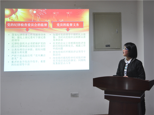 晚上6:00,会议准时开始。十一位积极分子依次上台。首先,严文辉、马天聪一组介绍了党章的基本内容、地位,概括了习近平总书记系列重要讲话精神。陶玉婷、毛佳昊、梁梦婷一组介绍了习近平总书记系列重要讲话精神、对党章的认识、中国共产党党内监督条例。宋镜如、陈蓉、王箐一组介绍了十八大对党章做的哪些修改、中国共产党党内监督条例的主要内容。吴天祺、陈静、蒲雅婕一组介绍了对习近平总书记系列重要讲话精神的看法、党内监督的重要性、党章的发展历程。冯晨冉对每组都进行了点评和问答题的提问,他们的回答都基本正确。最后冯晨冉对此次会议进行总结,发表了自己对PPT展示环节的修改意见,严明了第四党支部的纪律和要求。