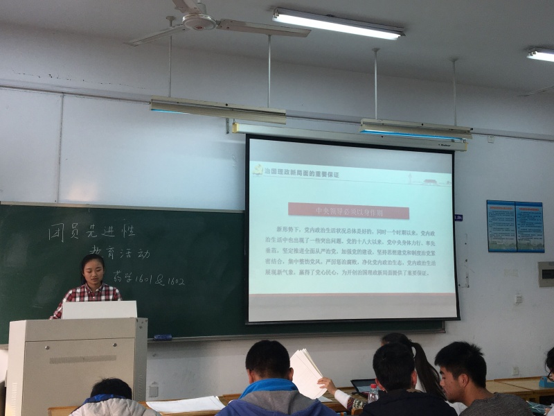 12月19日上午,全体药学专业16级新生在浦江A-506开展了团员先进性教育活动——聚焦十八届六中全会。团支部书记张铭雅同学主持会议并传达了十八届六中全会精神,领学了《中国共产党第十八届中央委员会第六次全体会议公报》内容。
