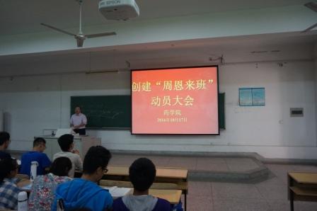 共承翔宇之志,同创优秀班级。为弘扬恩来精神,学习世纪伟人周恩来的高尚情操和伟大人格,并将周总理的传世风范和崇高精神发扬光大。推进学生思想道德建设,以此凝聚班集体,促进优良学风建设,2016年10月18日下午, 药学院在浦B401教室召开2016级“周恩来班”创建活动动员大会。学院2016级新生辅导员徐元龙老师出席本次会议,并对创建“周恩来班”提出了明确要求,以进一步指导各班级学习、弘扬、传承周恩来精神,增强实现创建“周恩来班”目标的信心和决心,深化“周恩来班”创建工作。出席此次动员大会的有药学院2016级全体新生、助理班主任、兼职辅导员。