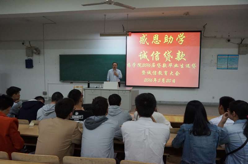 在会上,徐元龙老师向即将踏出校门、走上社会的贷款毕业生进行了“感恩助学 诚信贷款”为主题的诚信教育,使受助学生明白,在国家助学贷款帮助下,他们完成了大学四年的学业,成为一位合格的大学生,踏入社会后,诚信做人是为人的基本。国家助学贷款是一项信用的贷款,是对贷款毕业生诚信的考验,同时,向贷款毕业生讲清楚一旦出现违约将造成的不良后果。之后,徐老师详细介绍了国家助学贷款的基本政策以及明确的还款步骤,然后询问每位毕业生的实际情况,据此告知升学的同学可以申请贷款展期,就业的同学需根据后期与银行签定的还款协议按期还款。徐老师还通过往届毕业生的事例为同学们介绍了不同情况的偿还政策方法及常见问题的解决办法,强调了按时还款的重要性,用实例教育大家“自觉还贷、按时还贷、诚信立人”的道理。