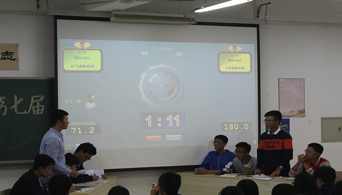 也许是有第一场比赛的铺垫,比赛刚一开始气氛便异常紧张。正方一辩以严谨的辩题含义解释开场,强调“要保护人权,死刑是非理性的”。反方也不甘示弱,从我国国情和死刑的威慑力等方面来佐证“死刑不应当被废除”的观点。在接下来的攻辩环节中,两队就国际范围内是否应当废除死刑展开了激烈而又精彩的辩论。正方二辩以“死刑造成的杀人案”为例,反方二辩则提出“应当维护生命权”加以反击。随后双方三辩又围绕死刑的利与弊展开了唇枪舌剑,双方互不相让。攻辩小结更是脑力与口才的双重竞争,反方咄咄逼人的态势给观众们留下了深刻的印象,而正方则从反方的漏洞下手,一针见血,赛场氛围在此时达到顶点。而在随后的自由辩论环节中,双方重点围绕“死刑的威慑力”展开了激烈的攻防战。在最后的总结陈词环节中,反方四辩流利全面的总结赢得满堂喝彩,为比赛奠定胜局。比赛到这里告一段落。经评委的认真讨论与点评,胜利方为表现更为突出的反方测绘1603班,而正方一辩冯宇同学出色的辩论技巧也获得评委们的一致认可,获得了最佳辩手的称号。