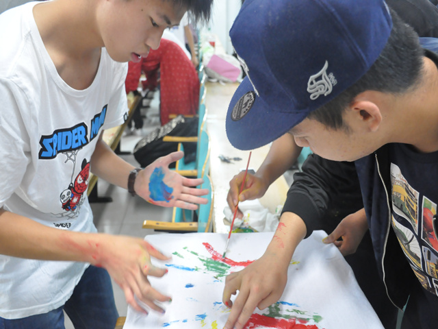 比赛开始,选手们根据自己的想法调配颜料,开始在洁白的T恤上画出自己设计的图案。小组成员们齐心协力,不时沟通交流,交换意见。主持人在比赛过程中也与选手积极交流,比赛现场气氛活跃。