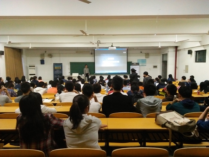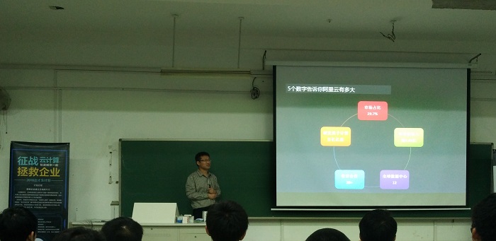 宣讲会于晚上6点30分准时开始,现场座无虚席。此次宣讲会主讲的云飞老师是阿里云认证讲师,资深项目经理。他由近期热门的人机大战事例,及其背后的大数据与云计算开始了他的公开课。首先,他介绍了阿里云的产品技术和其云计算、大数据的供应商,由“咻一咻”、“双十一”等事件背后庞大的参与人数体现出如今云计算与大数据技术的重要性。其次,云飞老师向在场同学介绍了阿里云核心产品——云服务器、云数据库、对象储存等及其解决方案构架。最后,他还介绍了“互联网+高校”战略,这既是为了促进高校大学生对云计算相关知识的理解和应用,推进云计算相关课程在高校的落地,培养更多的云计算和大数据专业人才,与高校共同推进云计算相关人才培养计划,也是为了同步推出面向高校学生和职场人士的阿里云在线技能学习,共建“互联网+高校”的新生态。
