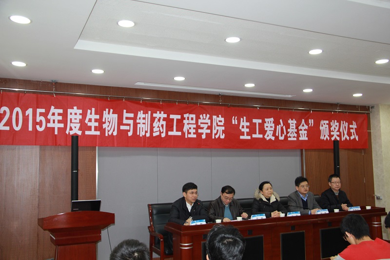 11月30日下午,生物与制药工程学院2015年度“生工爱心基金”颁奖仪式在生工楼报告厅举行。学院党委书记姜岷、院长韦萍、副院长李振江、副院长郭凯等出席颁奖仪式。学院党委副书记周辉主持颁奖仪式。