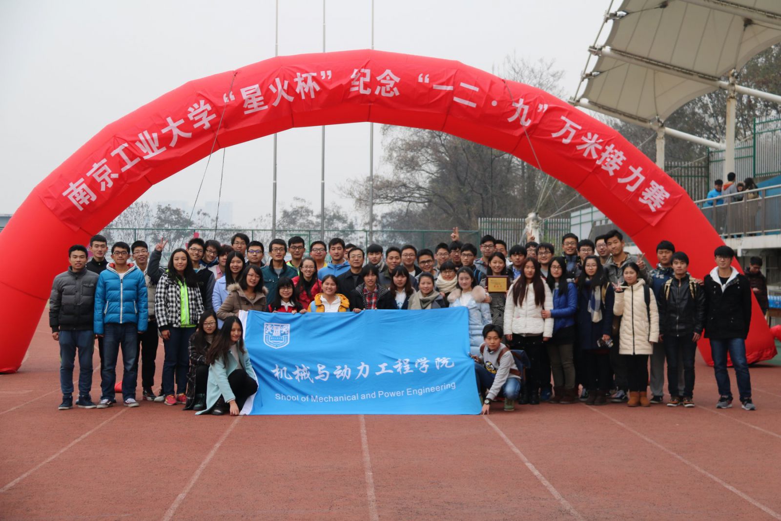 12月5日,由新利18彩票 团委、机械与动力工程学院党委主办,机械与动力工程学院分团委承办,新利18彩票 体育部、校园安全部、校医院应急救援队协办的第十五届“星火杯”纪念“一二·九”万米长跑接力赛在江浦校区田径场隆重举行。校园安全部部长朱兴同、校团委副书记朱忠祥、体育部老师杭华彬,机械学院党委副书记孙宇、分团委副书记程晓丹出席本次大赛开幕式,机械学院分团委书记王敏老师全程主持。全校19个学院积极参与,共计百名长跑爱好者在校园内完成了万米长跑接力,充分展现出我校学生的爱国热情及青春风采。