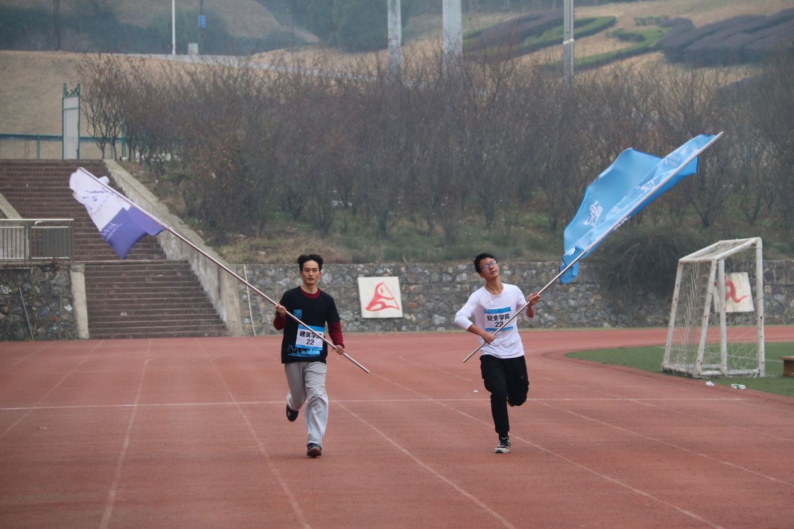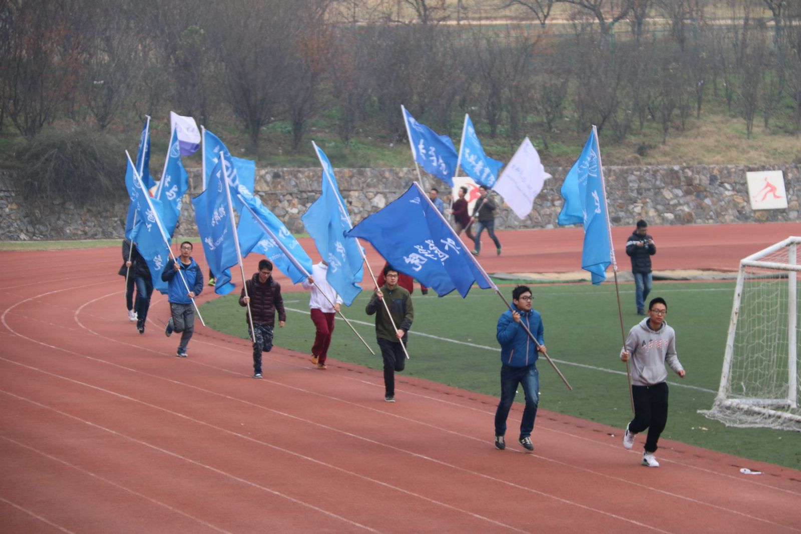 参加这次“一二·九”万米接力赛的运动员来自全校19个不同的学院,虽然天气寒冷,但运动员们的热情丝毫未减。上午九时刚过,校园安全部部长朱兴同老师打响发令枪,各院旗手挥着院旗自由绕场一圈后,接力赛正式开始。此次接力赛共设有22个接力点,接力赛路线是围绕校园两圈。每个接力点都有机械学院学生会的工作人员负责提供暖心开水和贴牌服务,并为各学院运动员加油鼓劲。