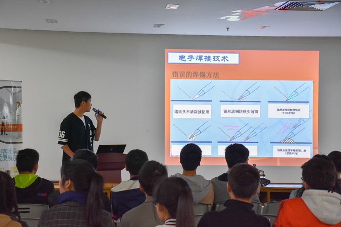 活动分为两个部分,分别是4月6日的电子焊接讲座与4月7日的电子焊接比赛,吸引了来自14个学院的178名同学报名参加。4月6日下午两点,电子焊接活动正式拉开帷幕,首先进行的是电子焊接讲座。有着丰富电子焊接经验的我院科协成员乔子昱主持了这次讲座。他认真讲解了焊接中的注意事项,并向同学们分享了自己的经验。在他的细致讲解下,同学们领会了焊接的要领,并进行了焊接实践。