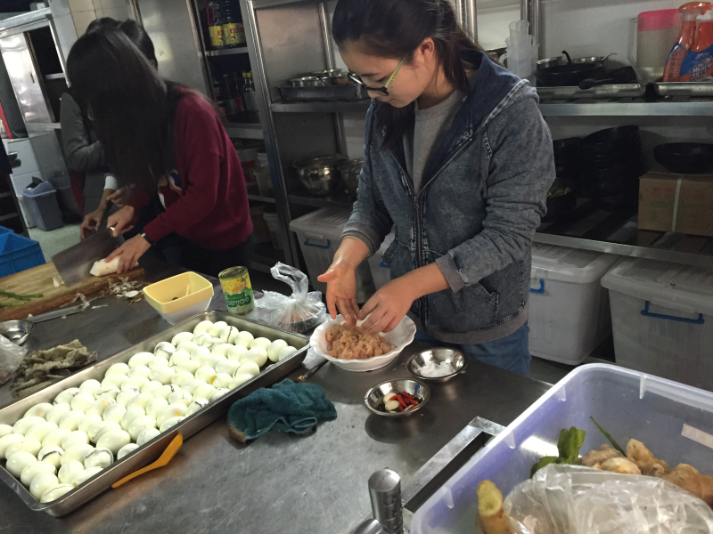 在报名阶段,参赛同学们进行了充分的准备,从药膳的材料来源、功能等对自己所申报药膳作品的制作工艺方案进行了优化,下午14:00,参赛的同学们签到完成后立即投入了紧张有序的比赛中。东苑餐厅厨房一下子挤满了许多同学,洗菜、洗锅、洗碗、切菜,一切都进行的有条不紊。评委也来到厨房间查看选手做菜的情况。每道菜肴都被分装成两盘,一盘被端上评委的桌子,另一盘便端下楼给过路的同学品尝。