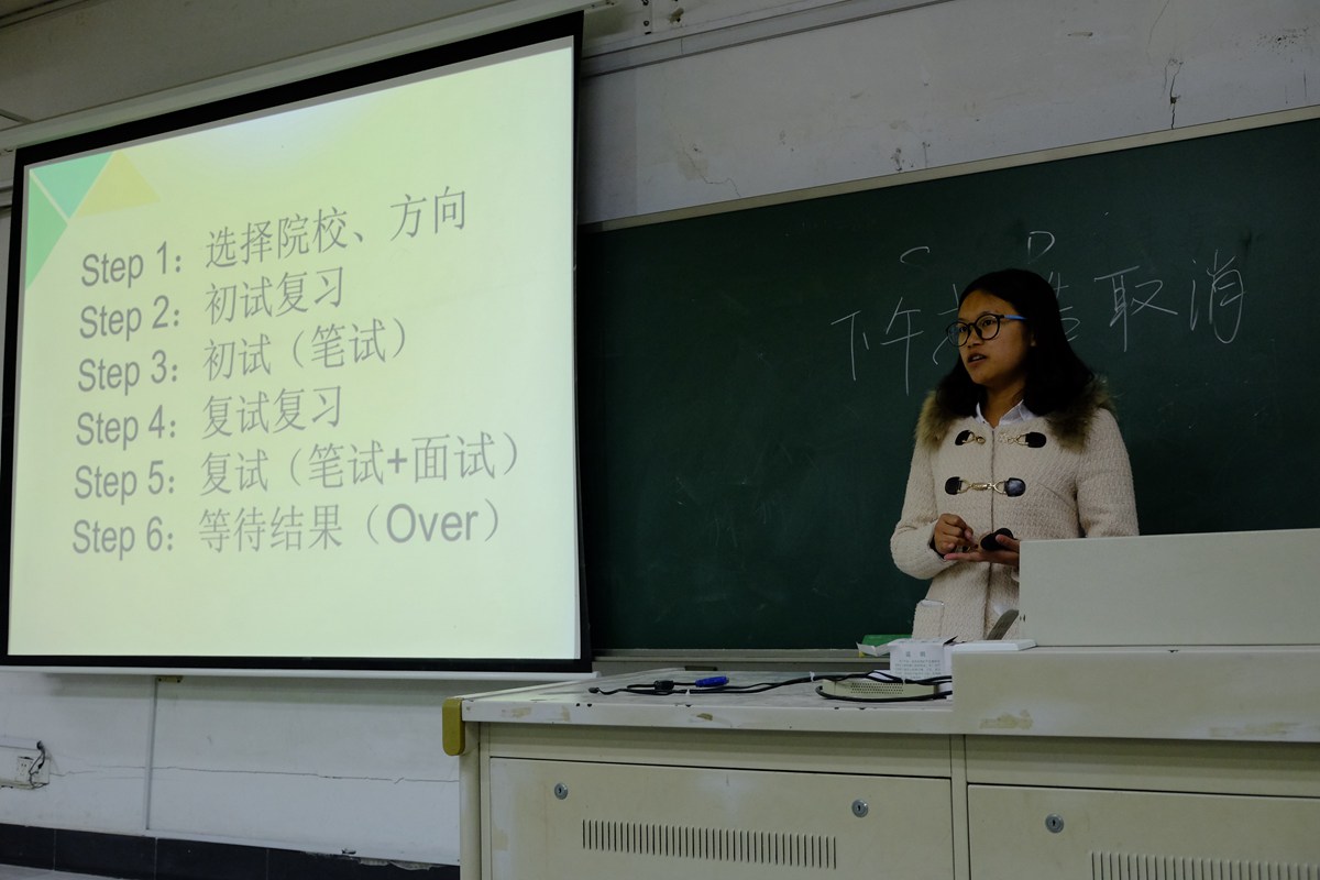 上午10时,讲座准时开始。张菲同学首先对考研情况进行了介绍与分析,让同学们先对考研有整体认识,帮助同学们从全局把握考研脉络。她说,在考研过程中要特别注重基础知识点的掌握,低年级的同学要把握时机打好基础,尽量理解每一处细节,即将要考研的同学要平稳心态一步步梳理知识点,只有这样才能在短暂的复习阶段中深入全面地把握考研要点。她还向同学们分享了自己的考研时间表,细致分析了在各个不同阶段的复习侧重点应各有不同。同学们要在夯实基础的前提下,结合自身特点制定特色的复习计划才能更大限度的发挥自己的潜力。不仅如此,她还就不同学科的特点向同学们介绍了她自己行之有效的学习方法,对同学们大有裨益。
