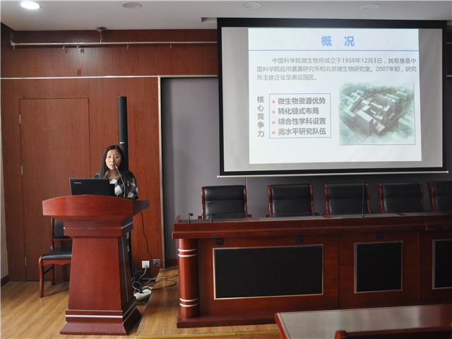 首先,中国科学院微生物所研究员、博士生导师,施一老师向同学们介绍了中国科学院病原微生物与免疫学重点实验室的总体定位和研究概况。施老师先简单介绍了实验室的历史沿革和“和而不同,跨越创新”的口号,然后具体介绍了病原实验室的研究方向和研究成果。施老师关于“西非埃博拉病毒”和“中东呼吸综合症病毒”研究的介绍,让同学们看到了病原体研究领域的地位和社会影响。接下来,微生物生理与代谢工程重点实验室的吴边老师,向同学们介绍了实验室的具体定位与任务、研究方向、研究队伍的整体情况、实验室承担任务的能力以及近期的研究进展。吴老师还介绍了他所负责的“用计算机设计新蛋白”的研究。