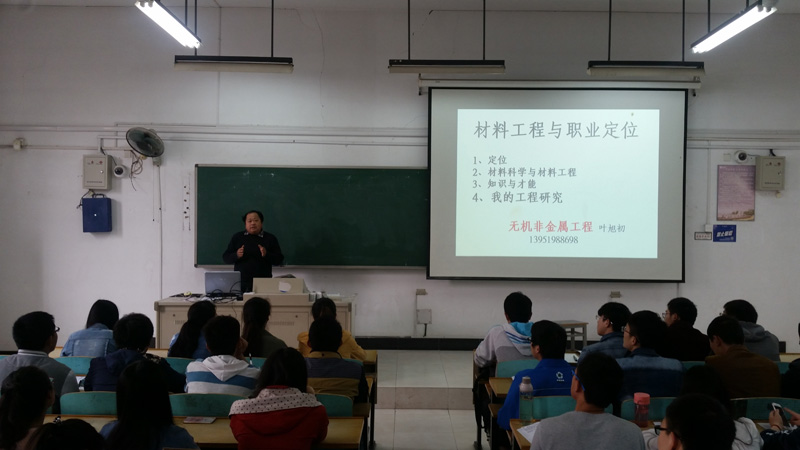 4月5日下午2:00,材料学院叶旭初教授在厚学302,为材料学院无机非金属材料专业大一至大三的同学开展了以“材料工程与职业定位”为题的专业讲座。