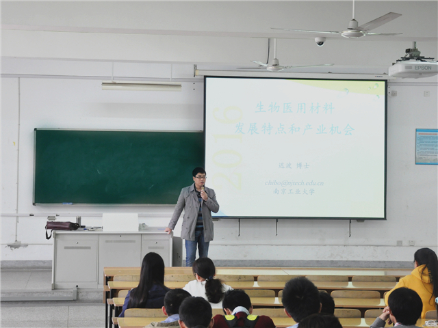 为帮助轻化专业的同学们更早地树立学习方向,提高学习效率,明确今后就业方向,4月7日上午9:00,食品学院大一、大二轻化的同学在浦江B楼404室参加了由南京领军型科技创始人才迟波老师主持的关于生物医用材料的讲座。