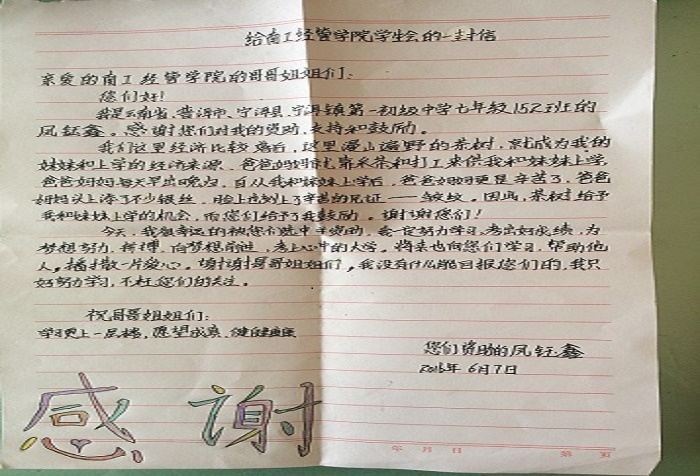 在本次活动中,经济与管理学院学生联合会志愿服务部组织成爱心团队,招募了几十余名志愿者,开展了“收集旧物”、“物资整理”、“摆摊义卖”等一系列校园互动体验活动。5月22日和28日两天,现场义卖活动分别在东苑食堂和象山举行。虽然活动当天骄阳似火,但丝毫没有动摇广大师生奉献爱心的热情。大批老师、同学加入到奉献爱心的行列,货品开售半小时即出现了多件商品脱销的场面。6月7日,在我校研究生支教团的帮助下,全部善款送到了宁洱一中两位成绩优异的初一贫困生手中。并承诺未来两年继续资助,直至两位同学完成初中学业。让我们非常感动和意外的是,6月15日收到了被资助学生的感谢信,让所有志愿者都为自己的辛勤付出感到值得和满足。
