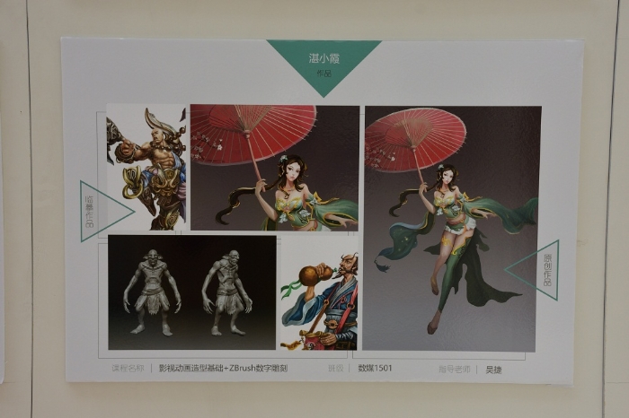 2015级数字媒体艺术专业学生从入学起,就在指导老师吴捷的带领下,学习了数字绘画和三维高模雕刻课程,在第一学年通过临摹和创意的调整,创作出了一批精美的设计作品。在一楼大厅展示的是数字媒体艺术专业共计38名学生的作品,每位学生的作品内容包括:影视动画造型、原画设计和三维高模雕刻。这些设计以影视特效模型和次世代游戏模型为基础,根据不同主题进行创作,其中以中国古典文化为主题的原画角色设计令人眼前一亮。围绕这个主题,学生结合了《封神榜》《西游记》和《红楼梦》等中国古典名著,运用了先进的CG绘画技术,将传统文化与数字媒体技术进行了创新结合,充分展现了数字媒体艺术专业高端的教学成果。