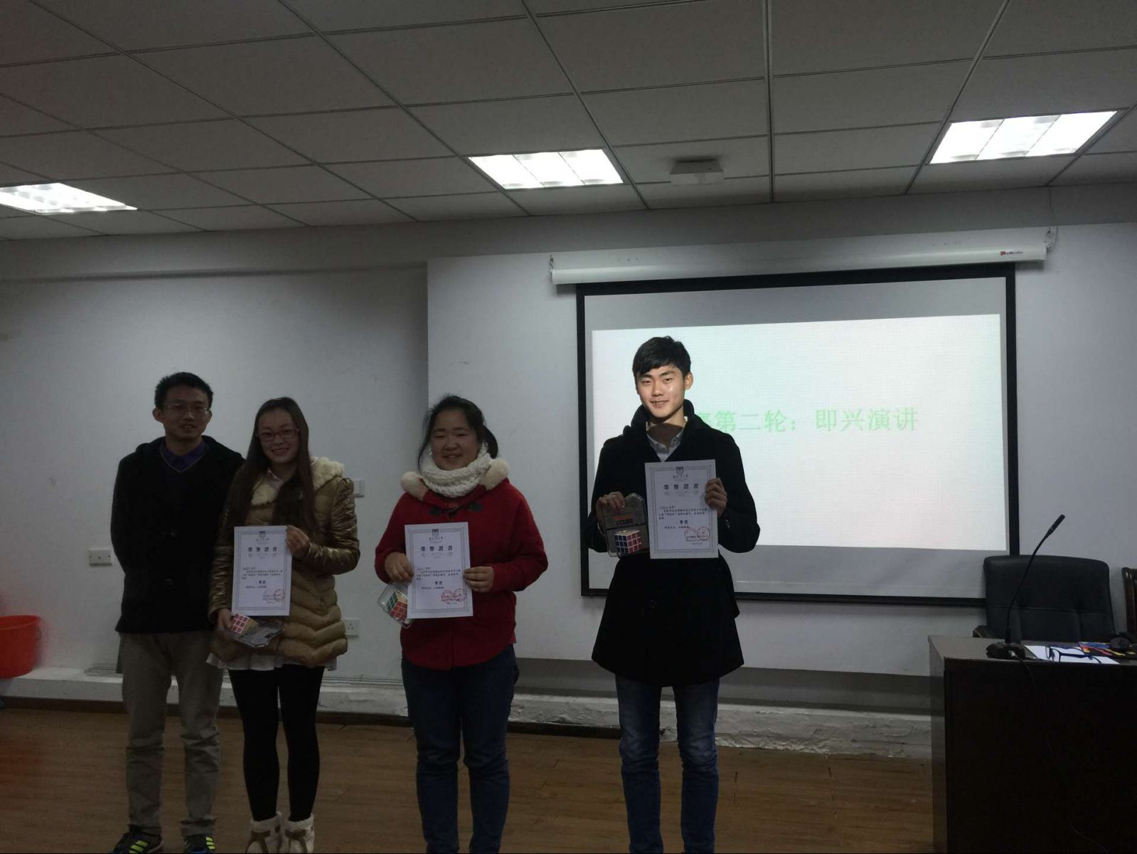 活动于1点30分正式开始,主持人清晰地介绍了本次演讲比赛决赛的流程。初赛晋级的12名选手,分为四组,每组三人。四组根据抽签,两两PK,平均分高的组进入第二轮。最终“ROC”队和“文财小队”战胜各自对手进入第二轮。中场休息十分钟后,比赛继续进行,第二轮中晋级的两支队伍现场观看视频,进行即兴演讲,最终“文财小队”获得了本次比赛的冠军。比赛现场掌声不断,中场休息抽奖环节气氛极为热烈。比赛全部结束后,主持人宣布了一、二、三等奖选手名单及冠军小组,圆满的结束了所有比赛。