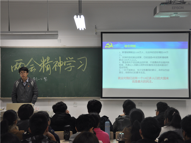 本次党课学习主要是为了加强党员与积极分子之间的沟通,并帮助积极分子深入的了解“两会”精神。本次党课共分为三个部分,首先冯晨冉向大家展示了政府工作报告,她先是带领大家回顾了2016年的各项工作,如“就业增长超出预期”、“大众创业,万众创新”、“供给结构有所改善”、“积极扩大对外开放”、“扎实开展‘两学一做’”等,再介绍了2017年工作总体部署,最后讲述了2017年重点工作任务。随后,梁梦婷介绍了“两会”期间习近平主席的时间安排,向大家简述了习主席访问的各代表团以及习主席关注的重点问题,其中她着重向大家解释分析了供给侧改革的含义。毛佳昊主要讲述了2017年李克强总理回答记者的19个问题,他把这些问题分为民生部分和外交部分并分析了总理记者会释放的信息,毛佳昊着重强调了大学生关注“两会”的重要性,呼吁每一位同志都能通过自己的努力实现人生价值。