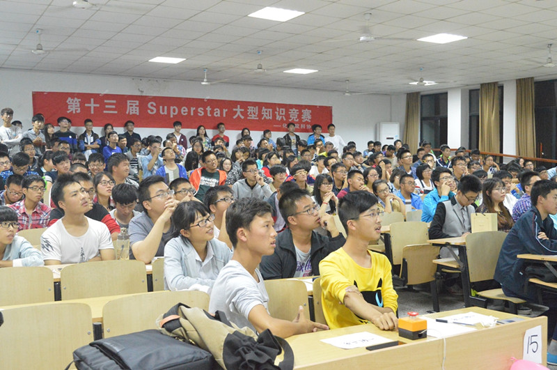 2015年10月20号晚6:30,由校团委主办、化工学院科协承办的“第十三届superstar大型知识竞赛”在浦江b楼501室顺利举行。出席本次活动的有化工学院党委副书记弋鹏老师、学生事务办公室主任兼15级辅导员王郁超老师、15级各班小班、学联主席团成员及部分中心主任。参赛选手为各班的精心选拔的优秀学生代表,同时每个班级还组成了智囊团给各自班级的选手加油助阵。