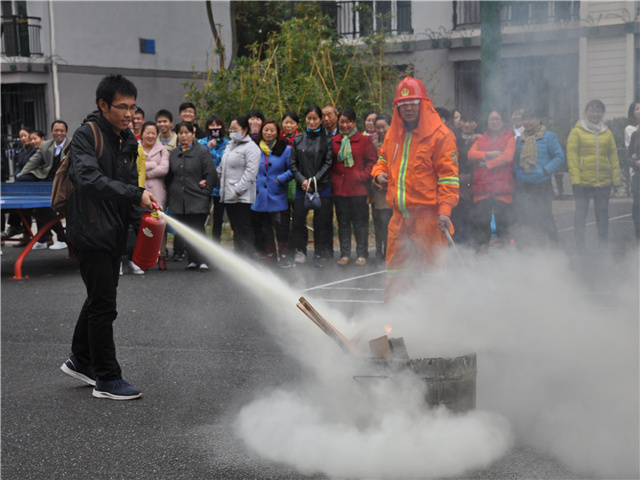演习结束后,工作人员开始为同学们讲解了遇到火灾时,逃生的注意事项、灭火器的种类及使用方法。在认真的听讲观摩后,同学们亲自体验了灭火器的使用,将用于演练的火堆迅速扑灭。